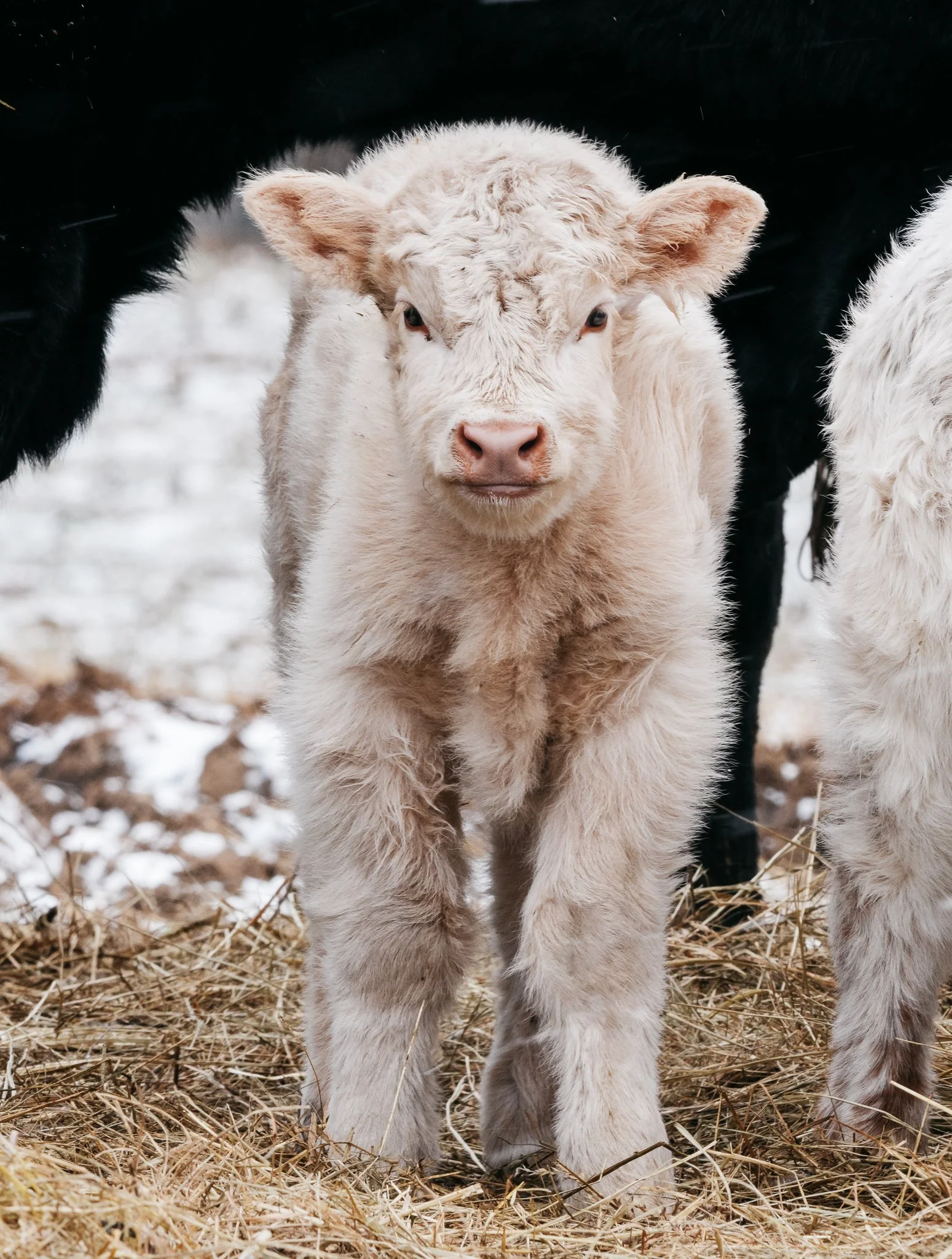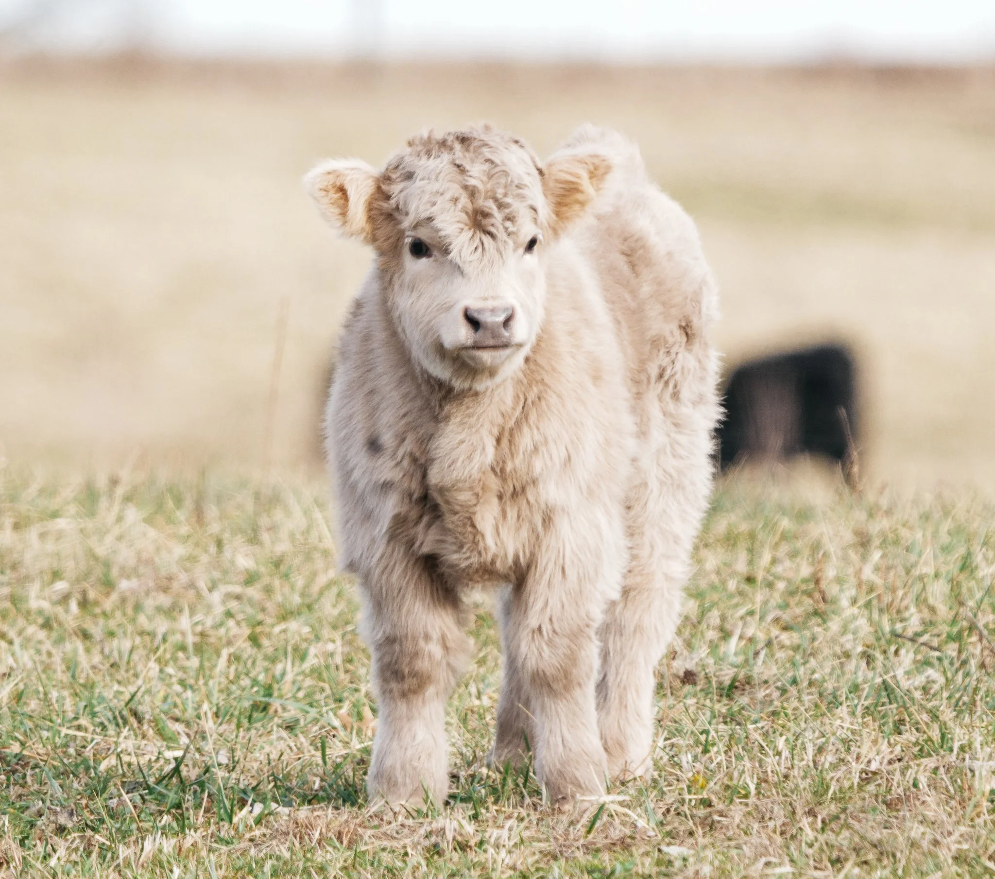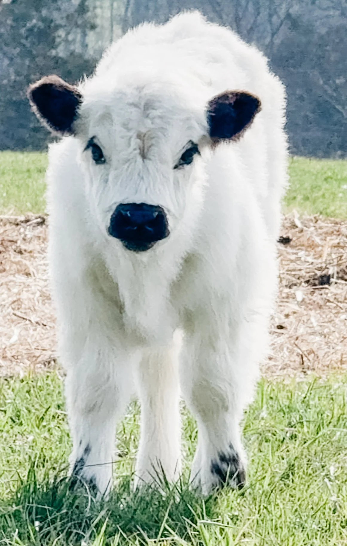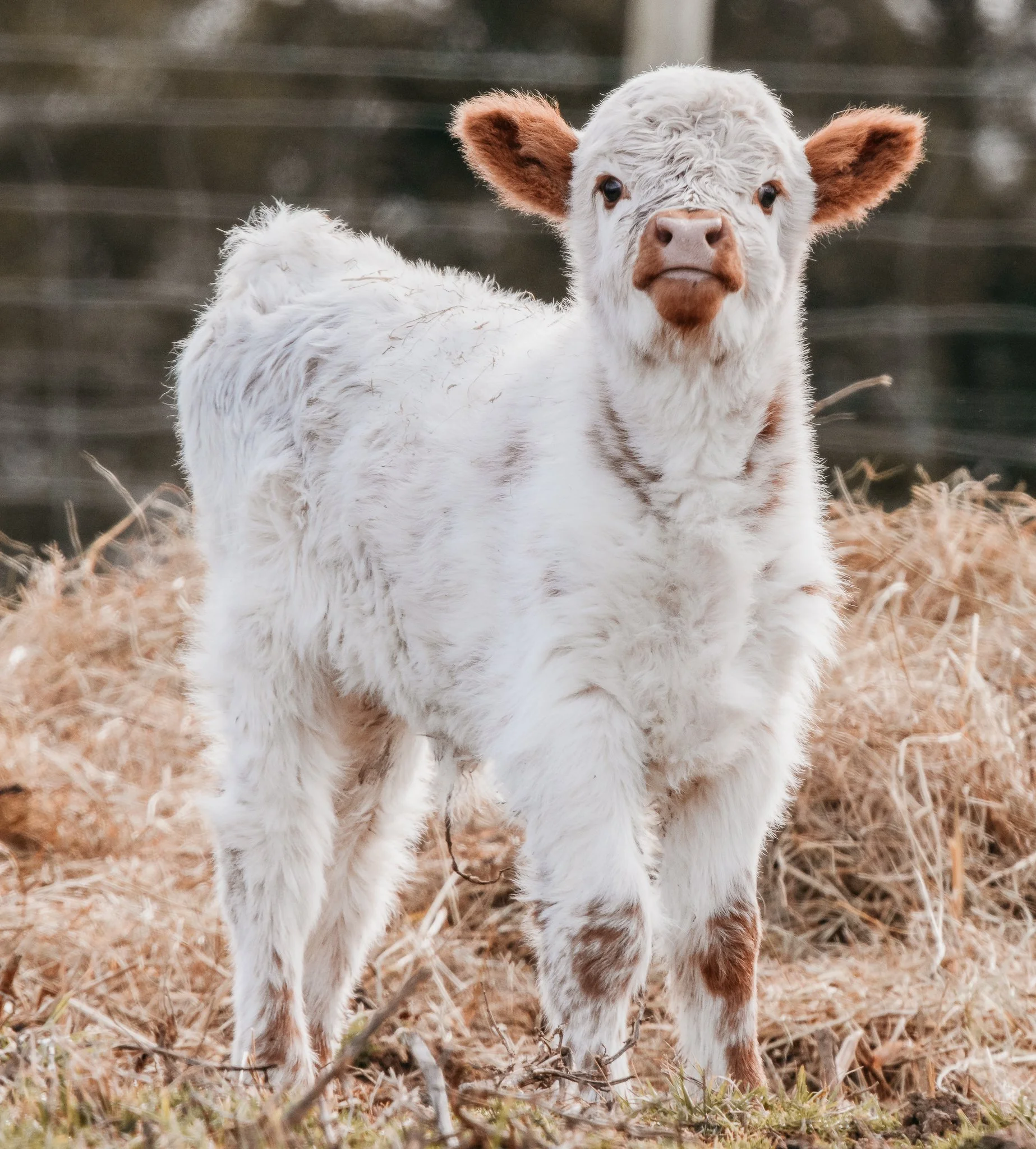 Welcome to the world, Finn! Finn was an embryo baby born to Romeo x Pansy. He is 75% highland, non-chondro, and white (test pending). Finn will likely mature in the midsize range and has the most beautiful head and hair. Finn would be a nice breeding prospect or steer companion. Finn will be ready in the July timeframe at weaning.