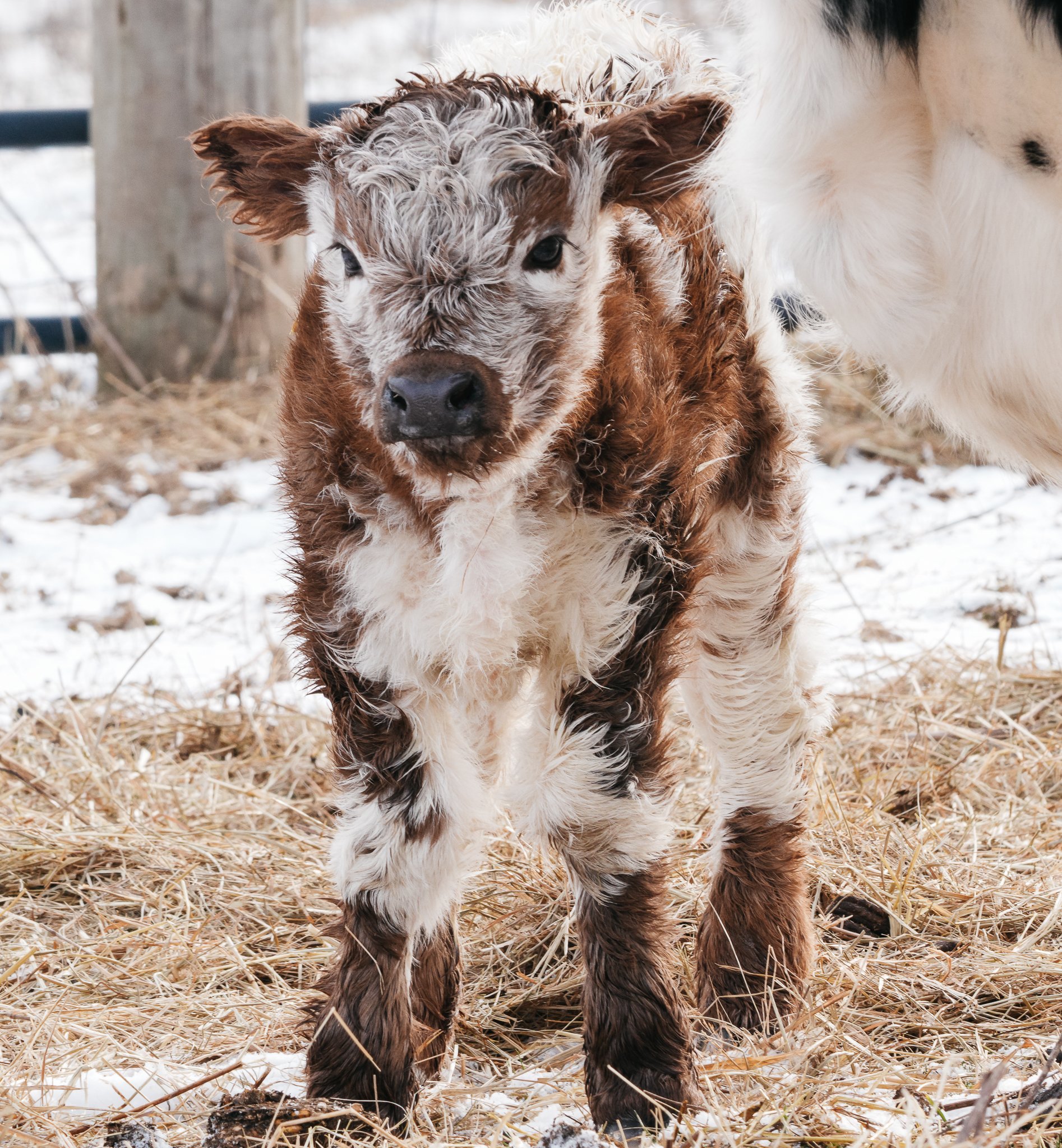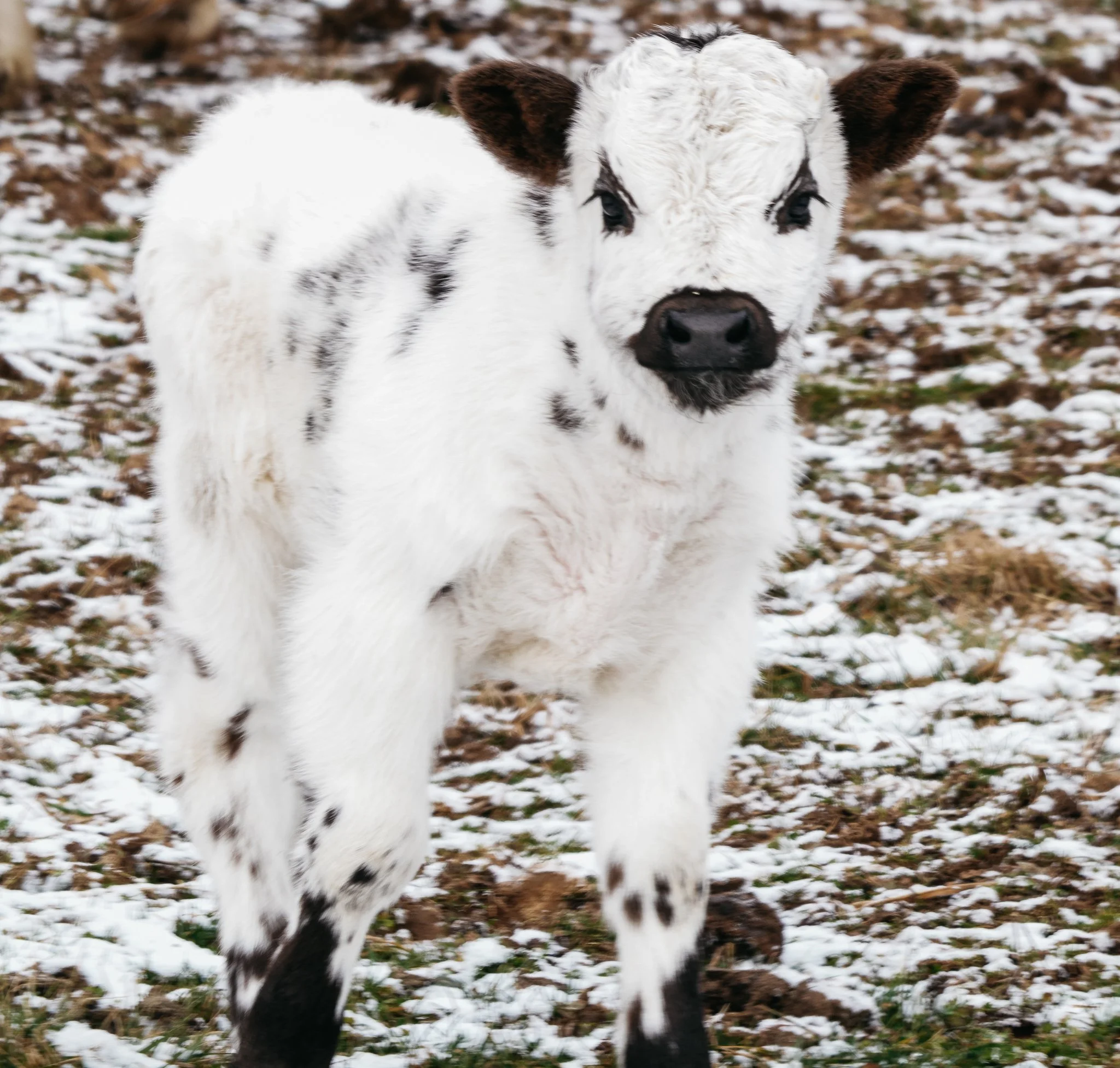 Welcome to the world, Freckles! Freckles is a gorgeous highpark (75% highland) born to first time mama, Honey x WB Charley. This guy has the most unique markings we have had and looks like a dalmation! Look at that eyeliner on his eyes! This is a really neat marked bull calf and would be a great addition to any breeding program. Freckles will be ready for his new home at weaning in July!